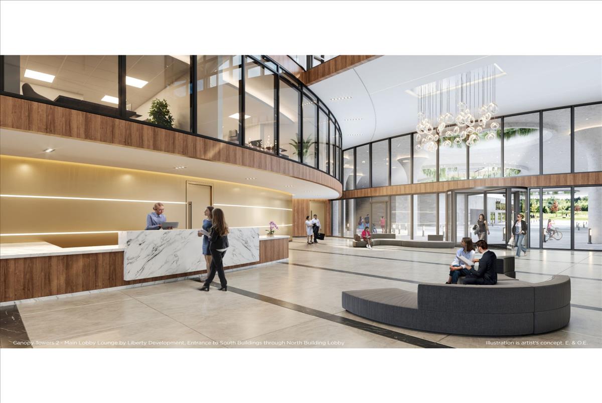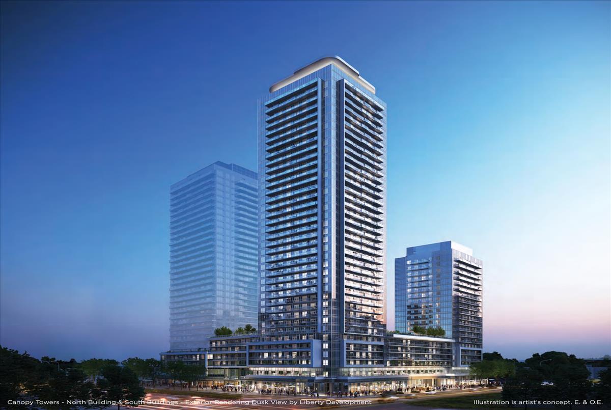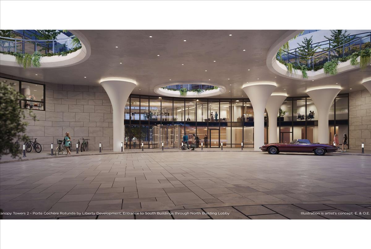 Concealed behind the base is a curved "lifestyle canopy" on the second floor. Below, it functions as a covered central porte cochère for residents arriving at the building, providing protection from the elements. Above it, a beautifully landscaped canopy transforms into an oasis, offering over 10,000 square feet of incredible outdoor amenities seamlessly connected to the outstanding indoor facilities. Combined with its advantageous location adjacent to the Mississauga Transit and Hurontario LRT, Canopy Towers offers an exceptional living experience.